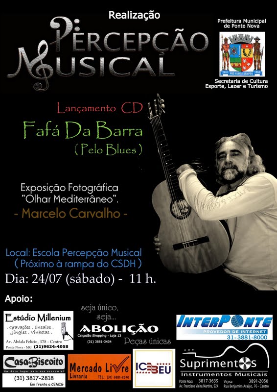 O cartaz que vem junto a esta postagem é referente à apresentação de Fafá do Blues que lança seu cd no projeto da Perceção Musical que FINALMENTE PODE CONTAR COM APOIO DA SECRETARIA DE CULTURA DE PONTE NOVA.